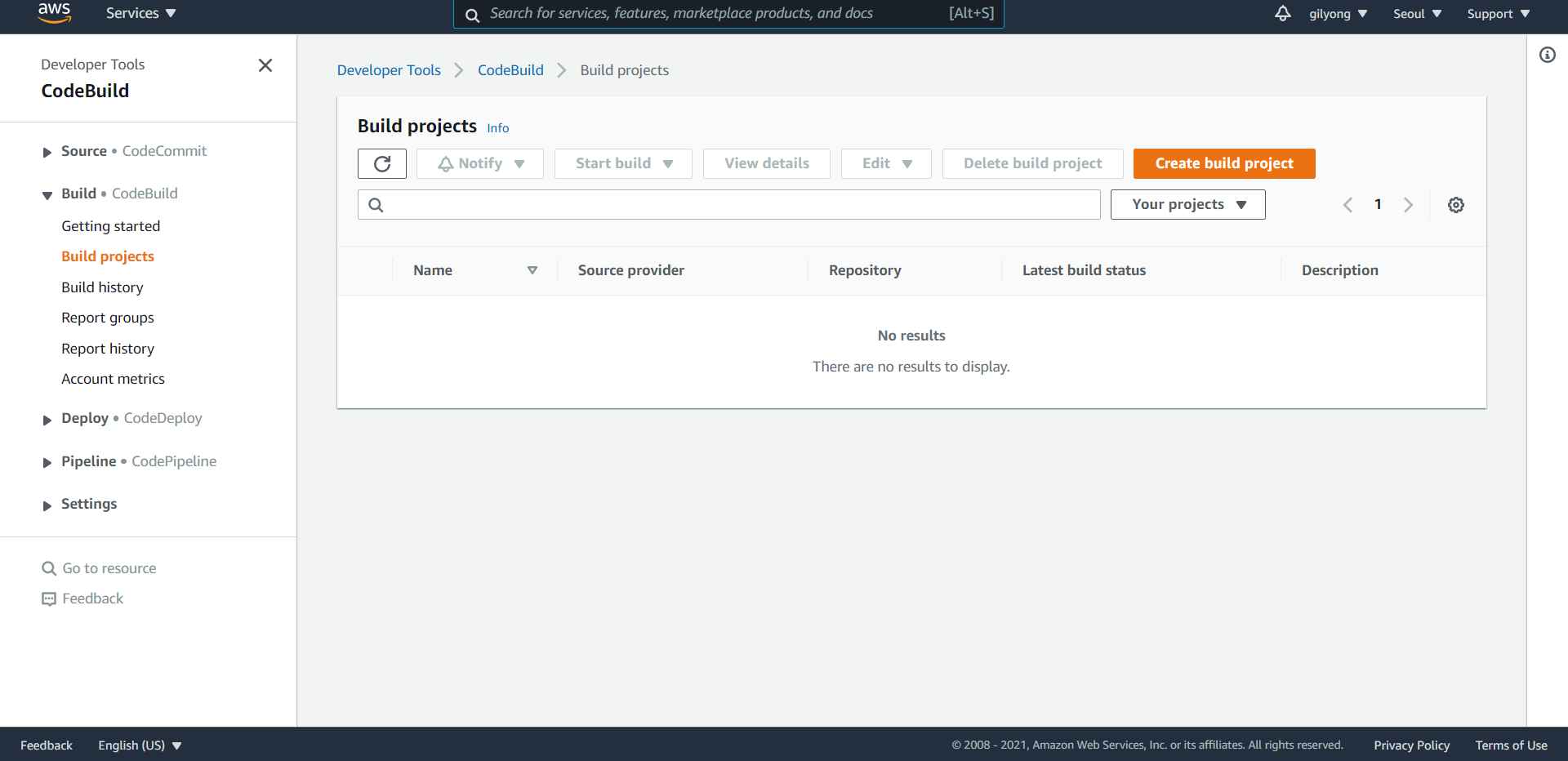 1. CodeBuild 콘솔로 접속해 'Create build project' 눌러 새 프로젝트를 생성해주자.