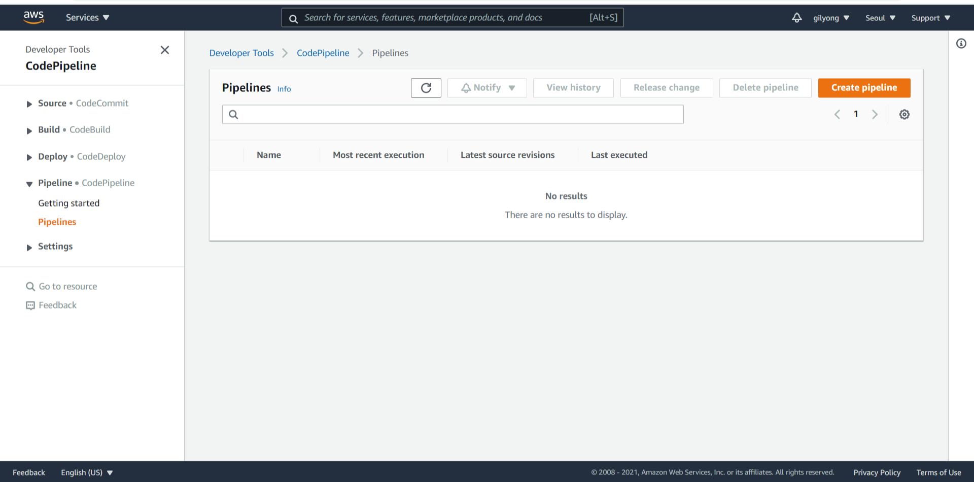 1. AWS CodePipeline 콘솔에 접속해 파이프라인을 생성해주자.
