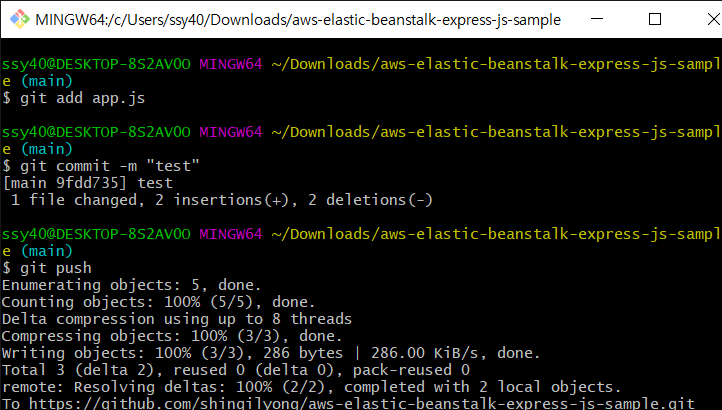app.js 소스 코드를 변경해준뒤 다시 Git push 해주자