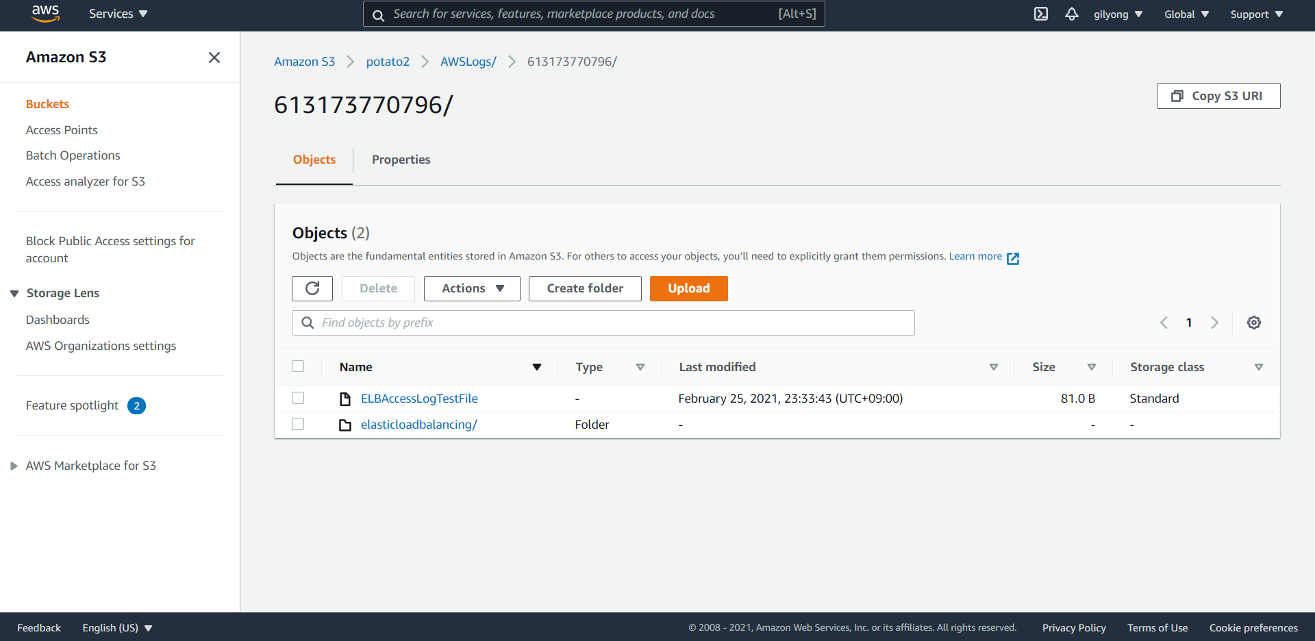 5. ELB 액세스 로그 활성화가 완료되면 지정했던 S3 버킷으로 가서 ELBAccessLogTestFile이 있는지 확인해주자.