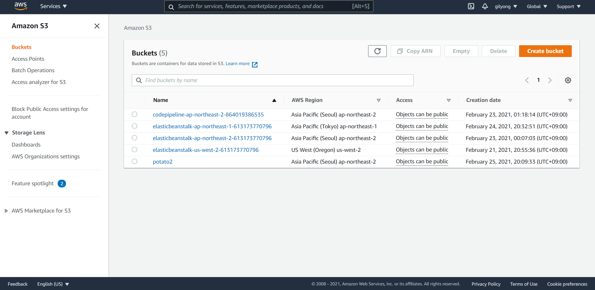 1. 우선 S3 콘솔에 접속해 액세스 로그를 받아올 버킷을 새로 생성해주자!