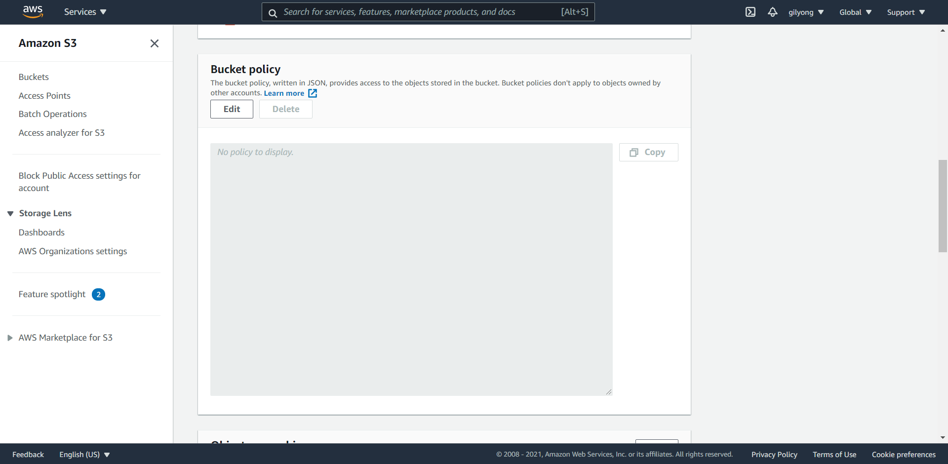3. Bucket Policy에서 버킷정책을 새로 만들어준다. 버킷정책을 통해서 사용할 버킷 지정해주거나, ELB 접근 권한, 사용자 계정 권한 등 정책을 설정해 줄 수 있다.