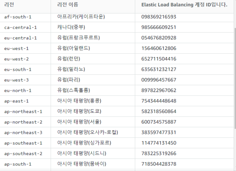 elb-account-id 도 이런식으로 숫자로 이루어져있다. 원하는 리전에 맞게 적어주면 된다.