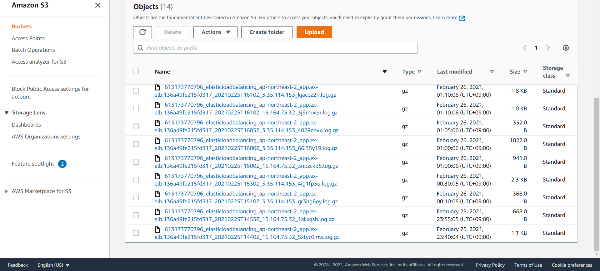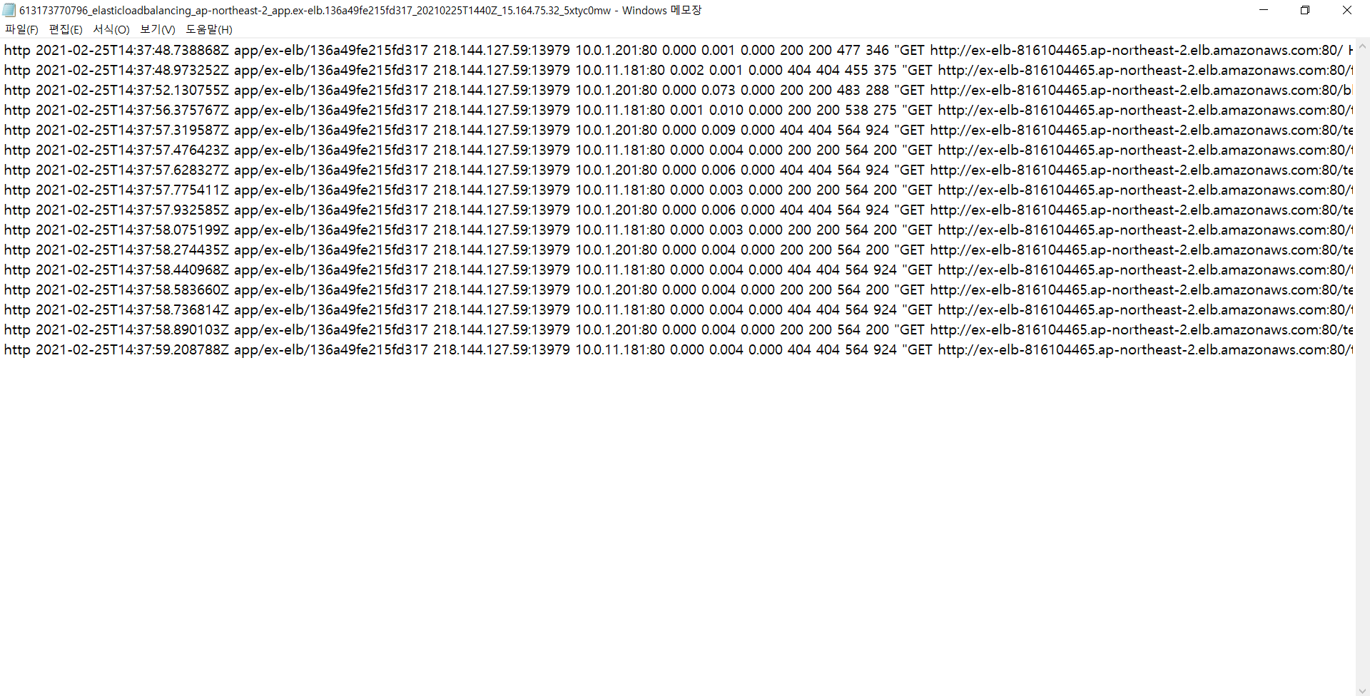 6. 이제 ELB DNS Name을 통해 웹에 접속할 때마다 다음과 같이 액세스로그가 파일로 저장된다.