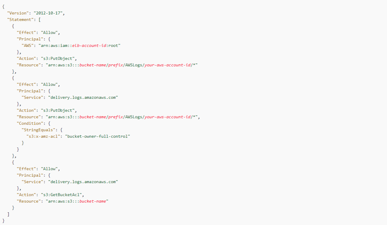 3. ELB에서 액세스 로그를 받아오는 버킷 정책이다. 위 AWS 공식 홈페이지에 설명이 잘되어 있다. 참고하도록 하자