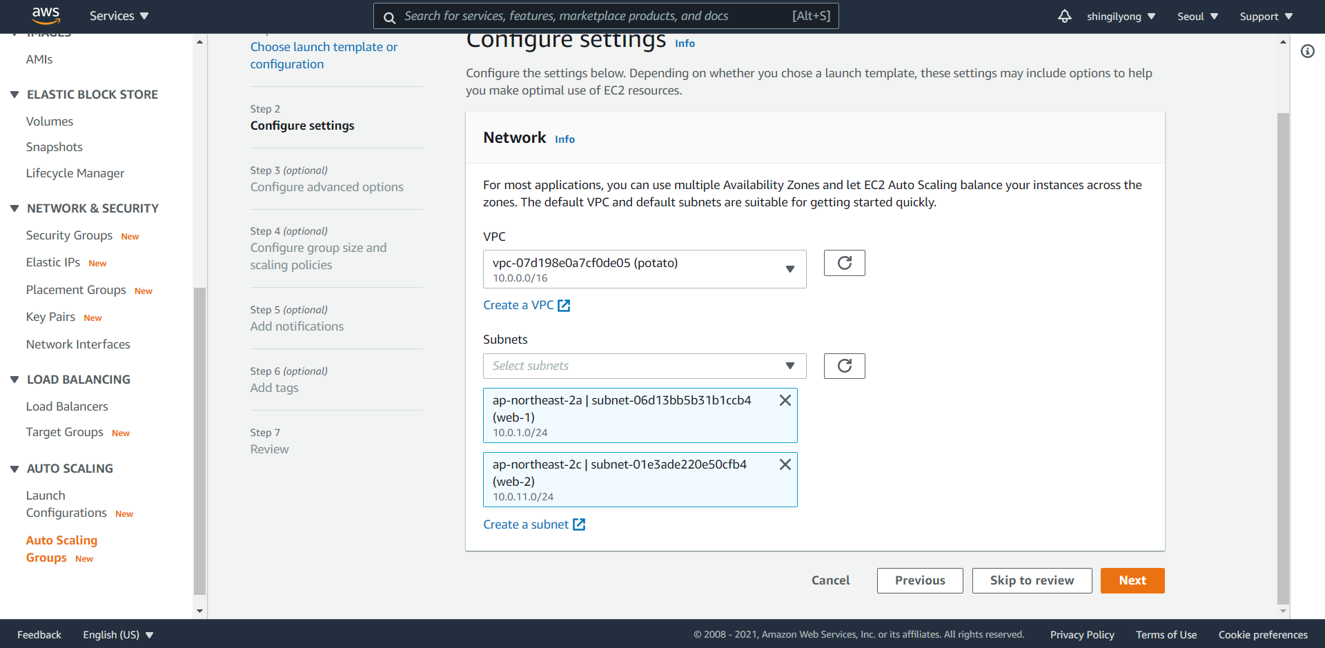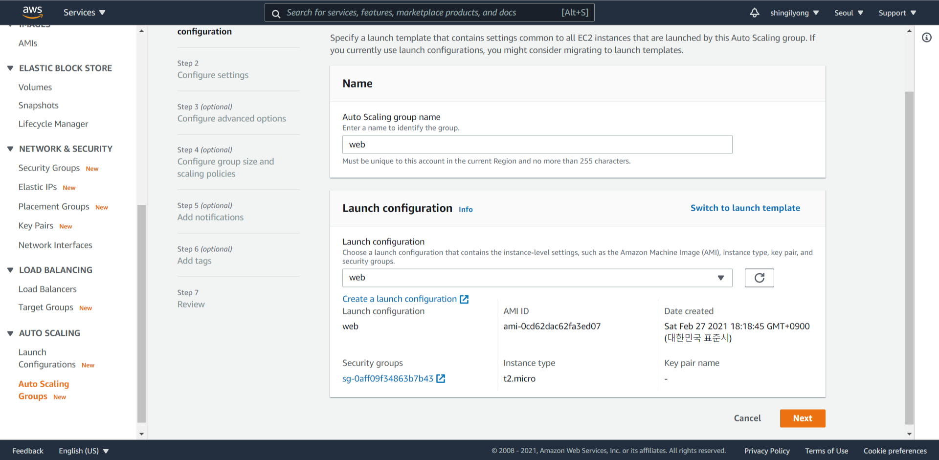 5. Auto Scalilng으로 자동 생성되는 시작 구성을 설정.