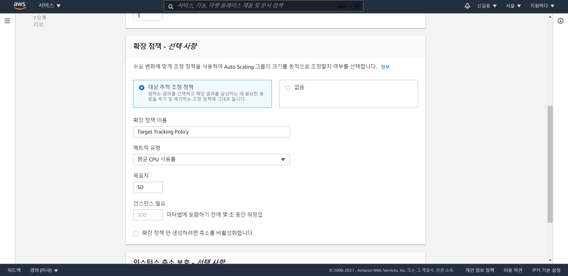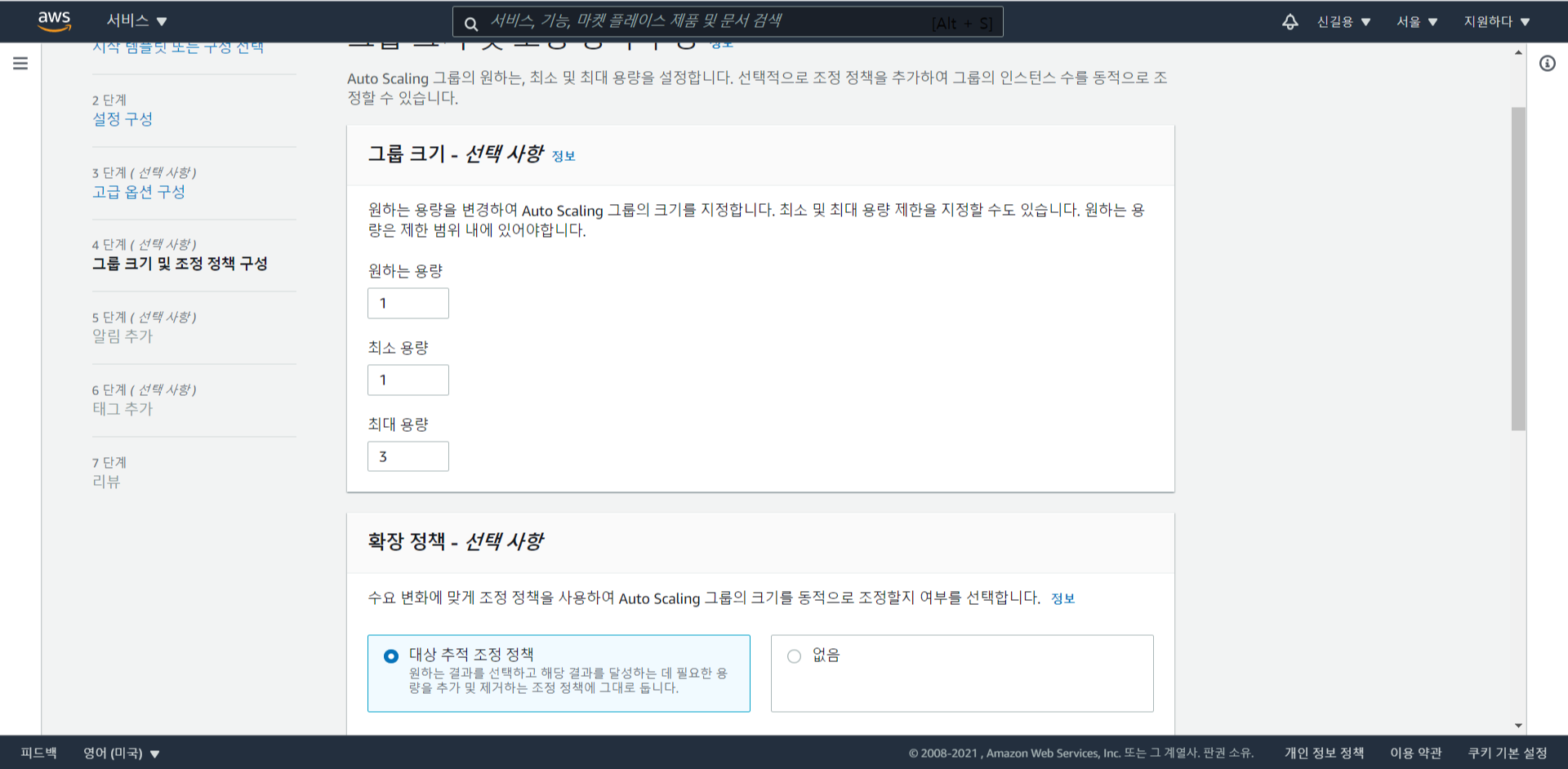 8. 생성되는 인스턴스의 최소 및 최대 크기를 설정할 수 있다.
