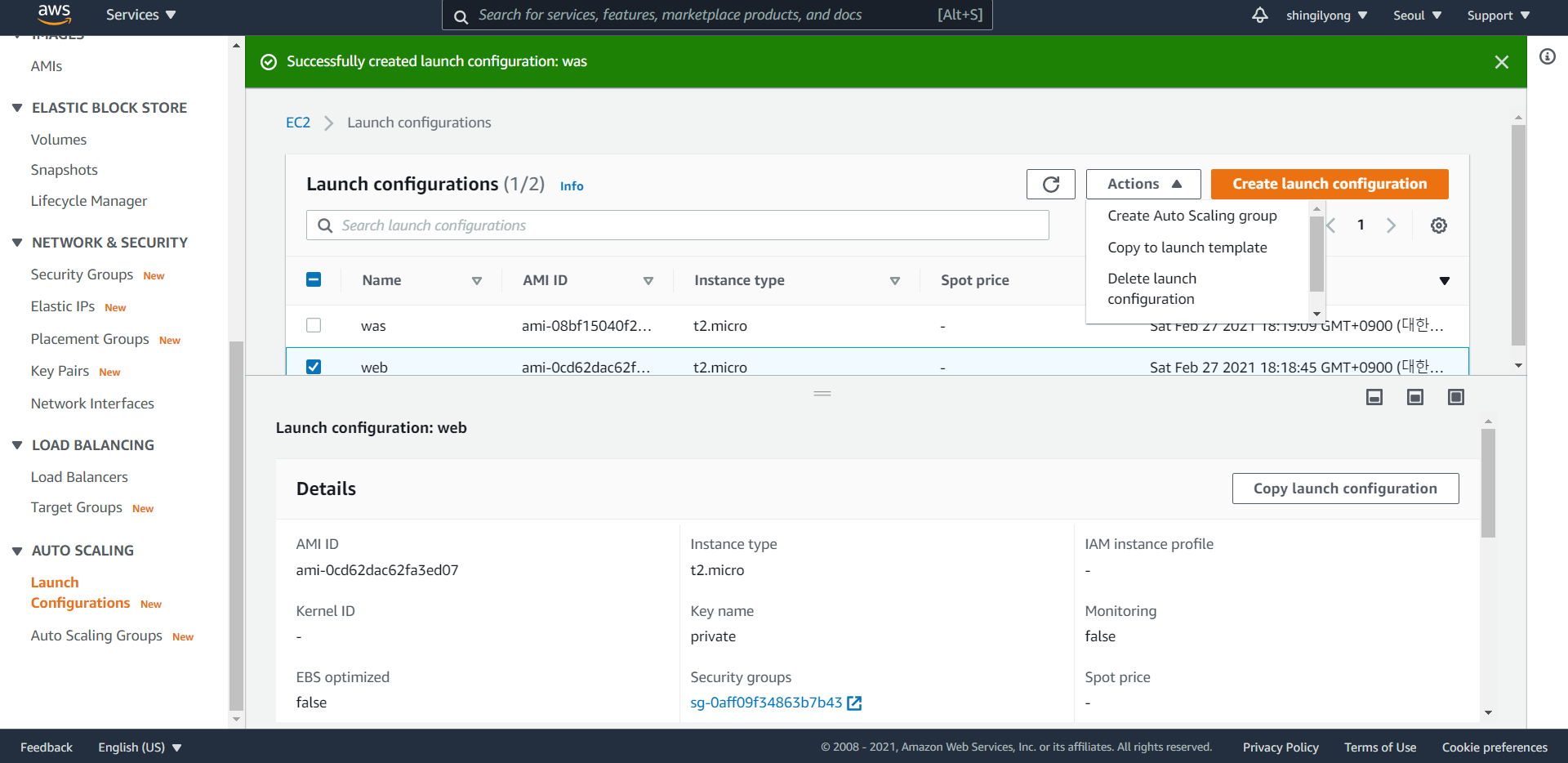 4. 다음과 같이 시작구성이 생성되었으면 이 시작구성으로 Auto Scalilng Group을 생성할 수 있다.