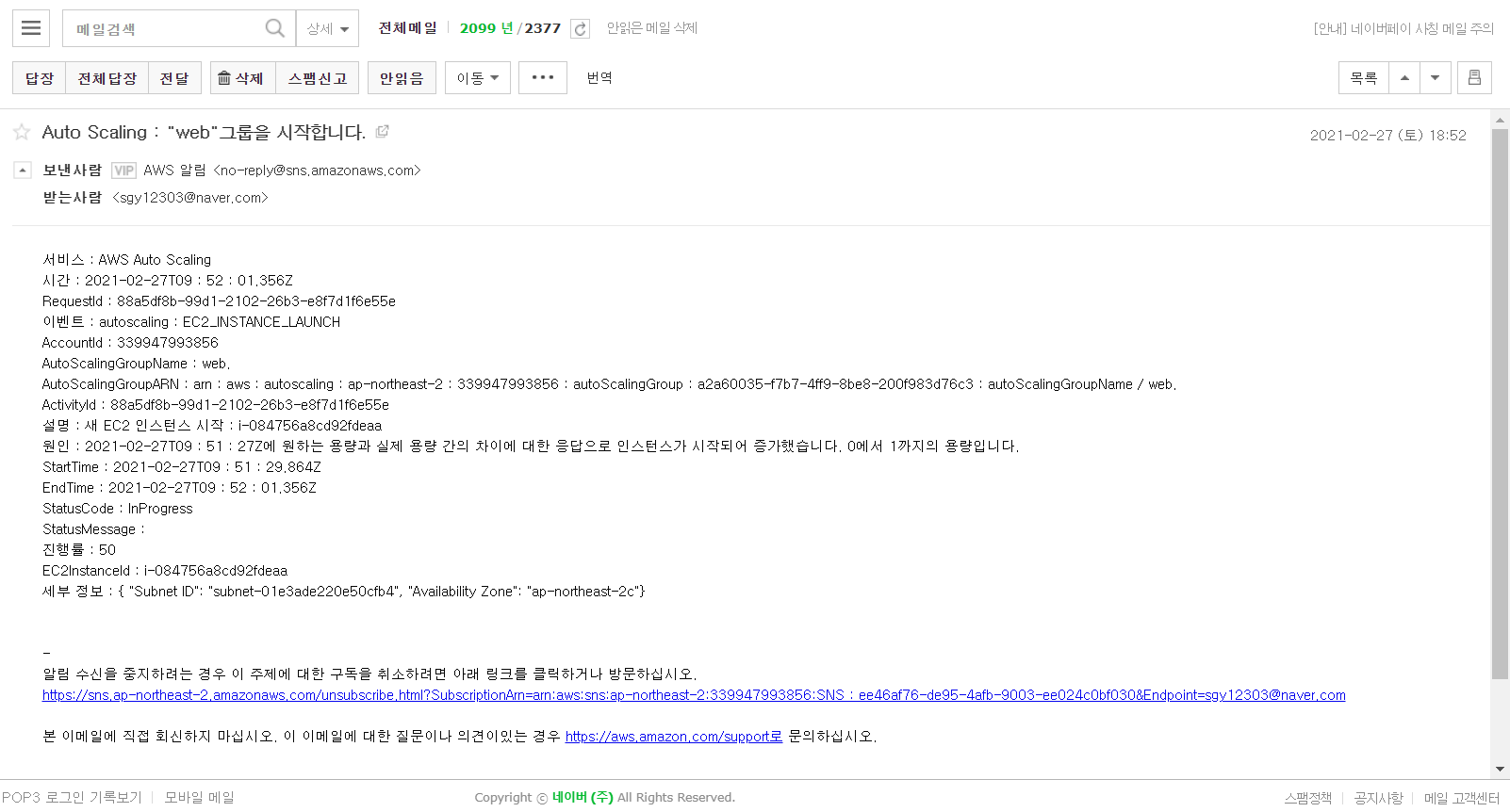 13. Auto Scalilng Group에서 이벤트가 발생할 때마다, AWS SNS에 등록해두었던 이메일로 알람메시지가 가게된다.
