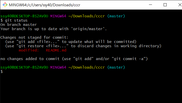 git add 로 README.md 파일을 수정해주었다. modified 상태