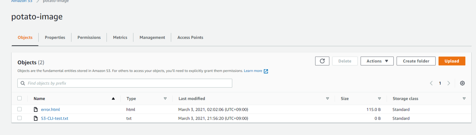 아래와 같이 버킷 폴더에 파일이 업로드 된 것을 확인할 수 있다.