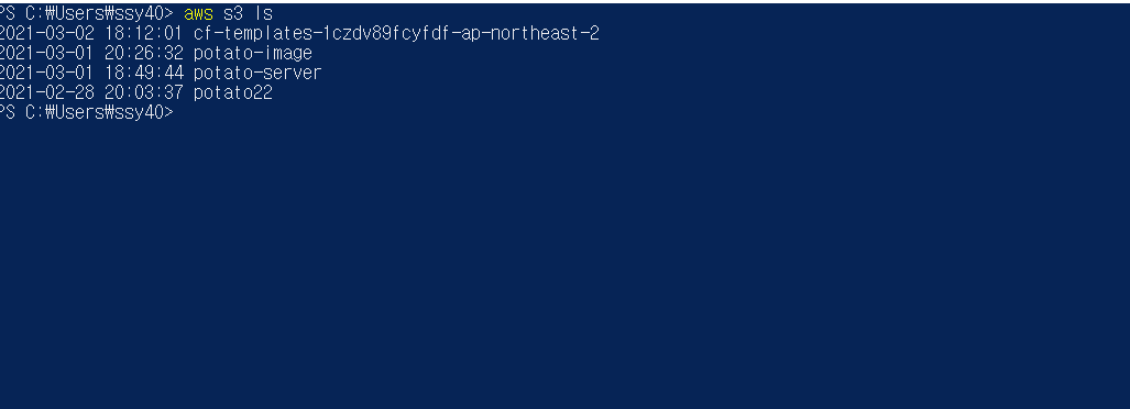 설치와 구성이 제대로 되었다면, 아래와 같이 s3 명령어를 실행했을 때, 내 aws 계정과 연동하여 사용할 수 있다.