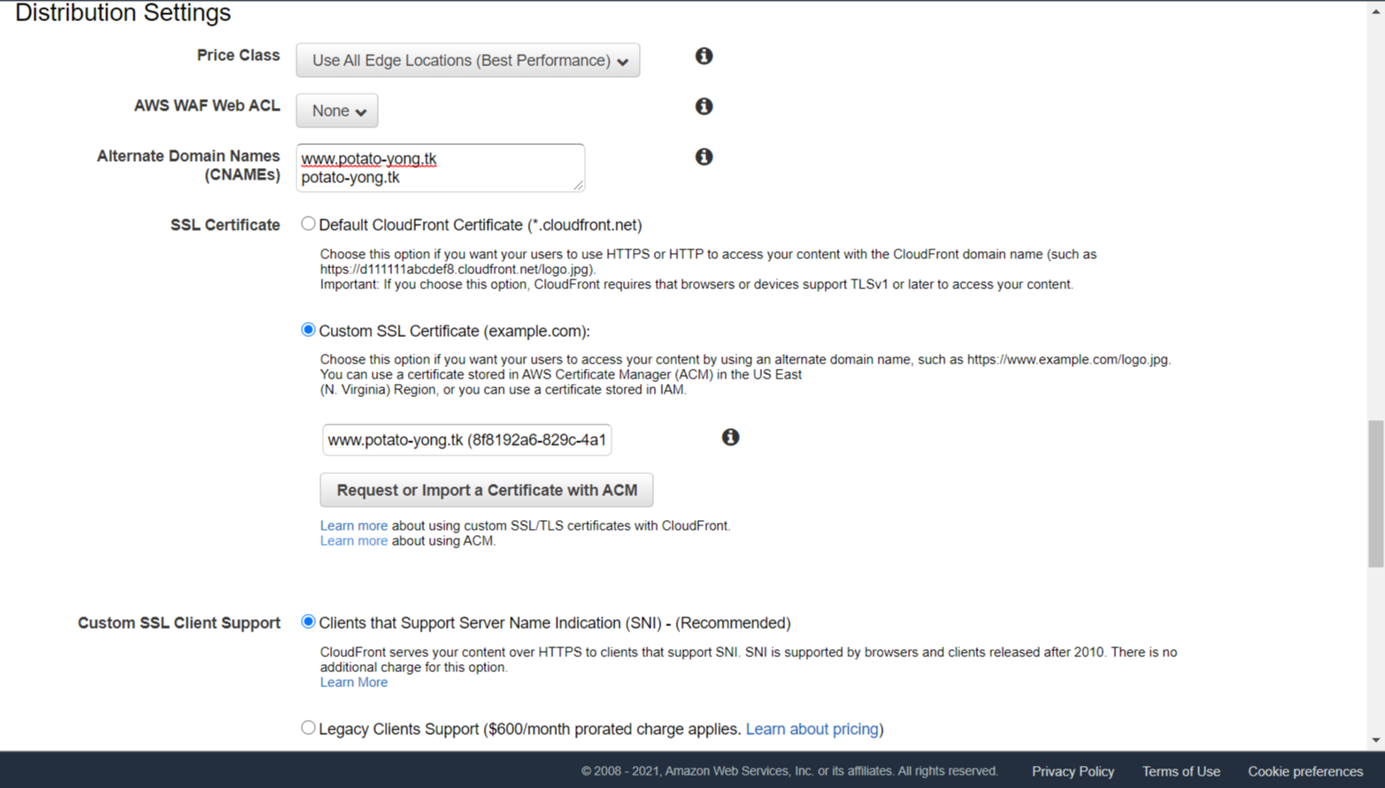 도메인 주소에 CNAME을 정해주자. CNAME을 지정하려면 ACM 버지니아 리전에서 SSL 인증서를 발급 받아야 한다.