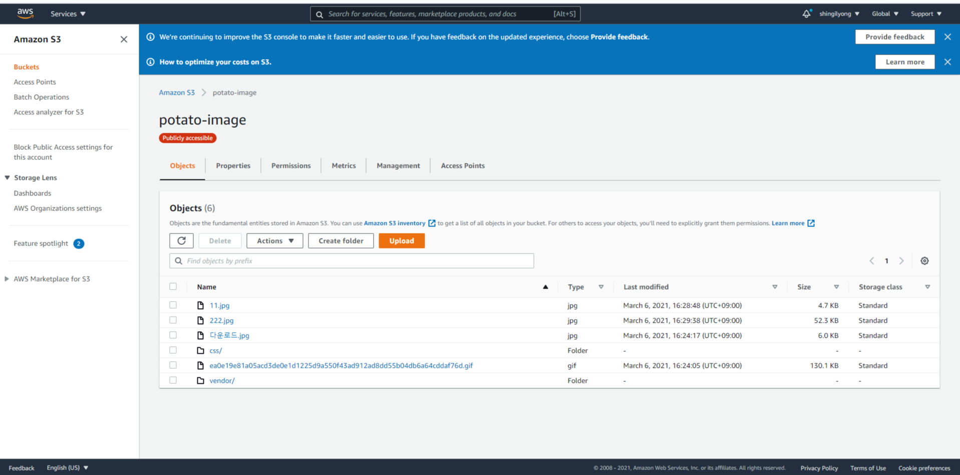S3 버킷을 새로 생성하고 JPG,CSS,js같이 정적인 파일들을 미리 업로드 해두었다.