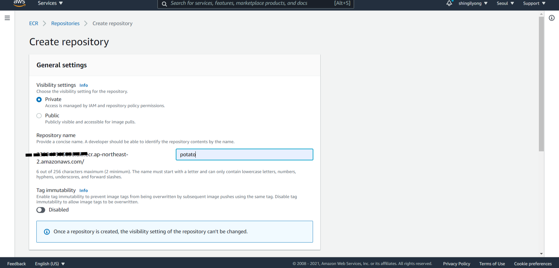 6.1 ECR 콘솔에 접속하여 다음과 같이 프라이빗 레포지토리를 생성해준다.